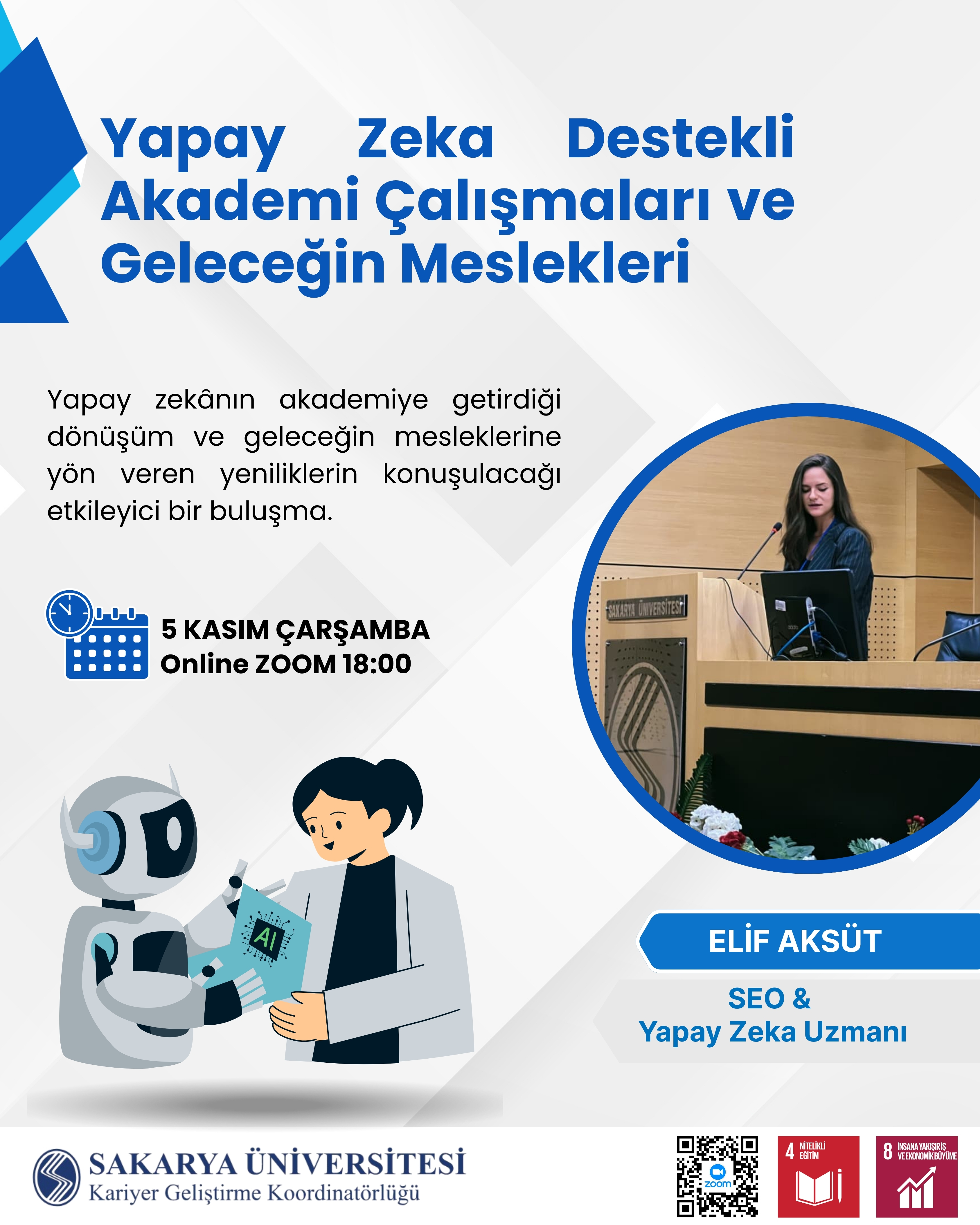 Bu hafta Yapay Zeka Destekli Akademi Çalışmaları ve Geleceğin Meslekleri adlı online etkinliğimizde geleceğe yön veren teknolojileri konuşuyoruz!